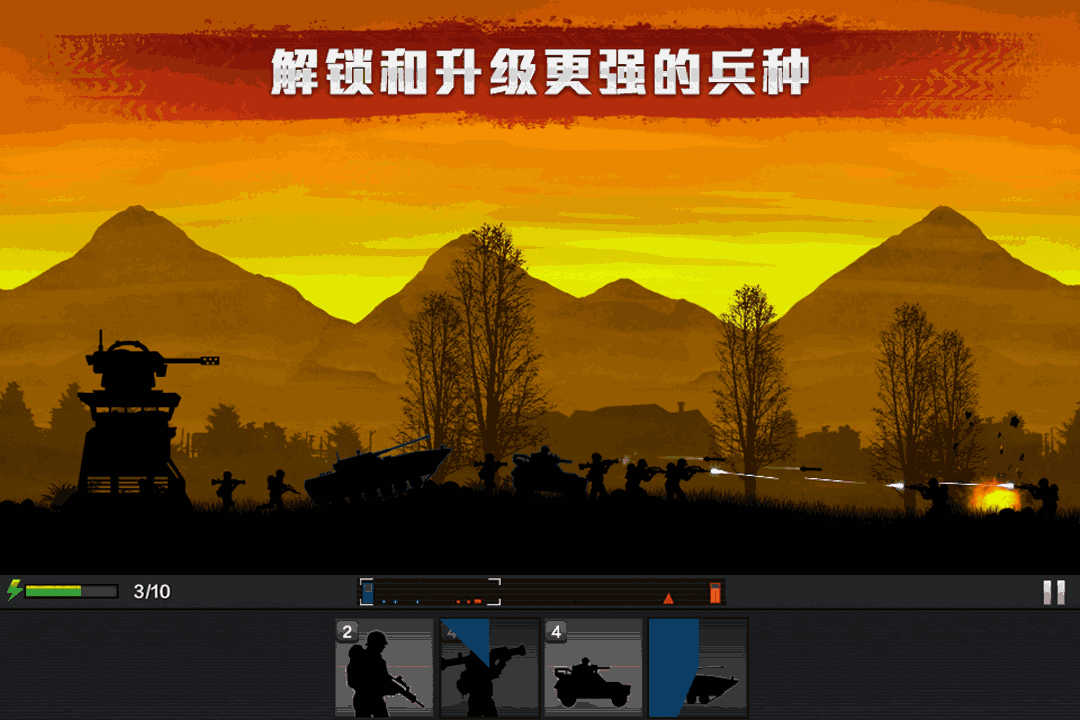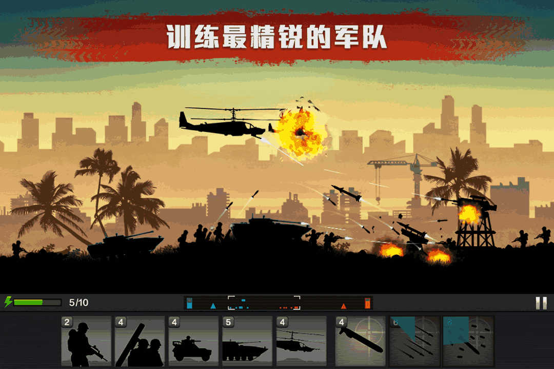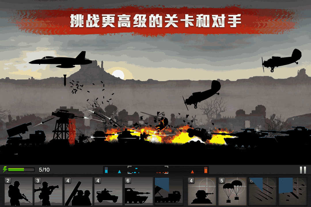 带领你的军队体验夕阳西下或是黎明破晓等不同的10个战斗场景,结合2D剪影效果和特效蒙版的处理,以黑色幽默展现真实战场。全程紧张刺激的配乐和音效,流畅的爆炸射击动画效果,让你切身感受到作为战地指挥官的神圣使命感;