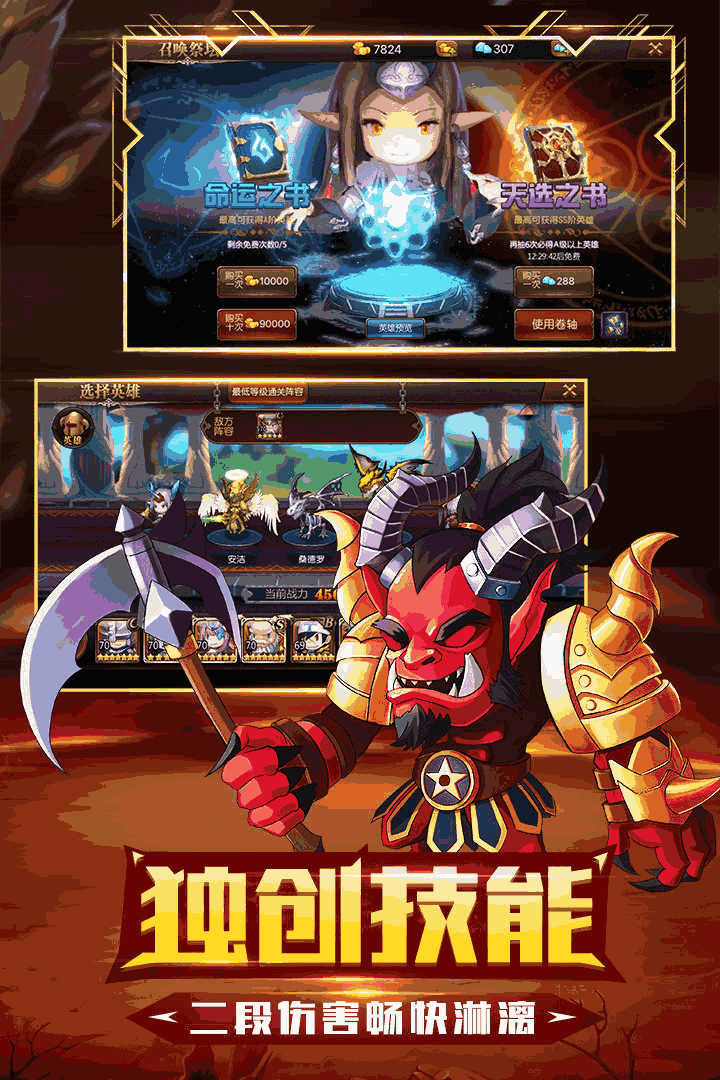 游戏中有着独具创新的二段技能机制,以及高度细化的养成系统,玩家们不仅可以对英雄进行各种进阶升星的升级操作,还可以根据英雄的特效,合理的对装备的进行强化,玩法非常多样化!
