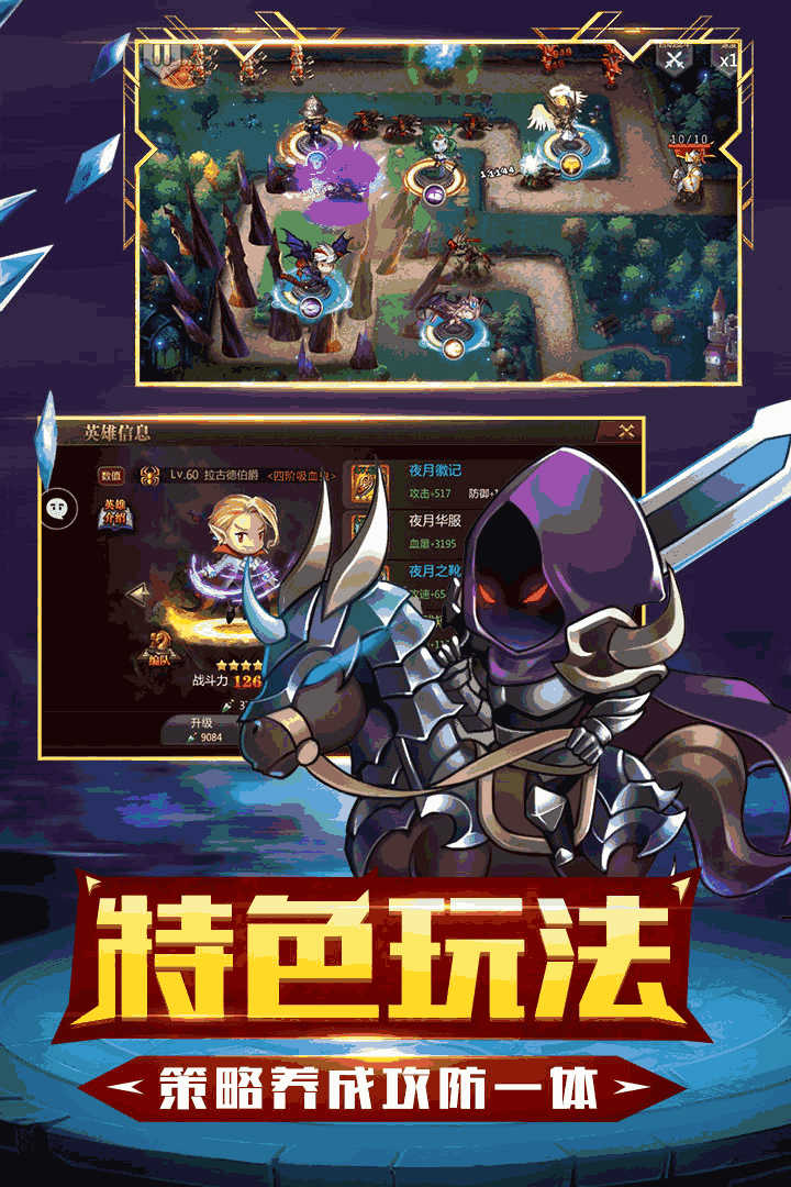 1、打破传统守塔玩法,创新推塔玩法,拒绝枯燥,玩家英雄放入塔防固定位置,使用滑屏、点击英雄释放技能,主动攻击。