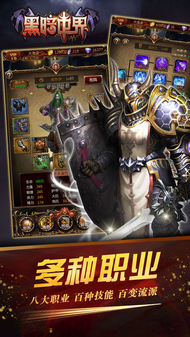 《黑暗世界》是一款可玩性极高的放置挂机类手机游戏,游戏的职业均衡度设计的超级合理,对新手不氪金的玩家也很友好,虽然抽不到金卡但是也玩得下去,蓝卡紫卡也能进化成金卡这一点非常舒服,总之,一定会支持,难得的精良之作了。欢迎下载体验!