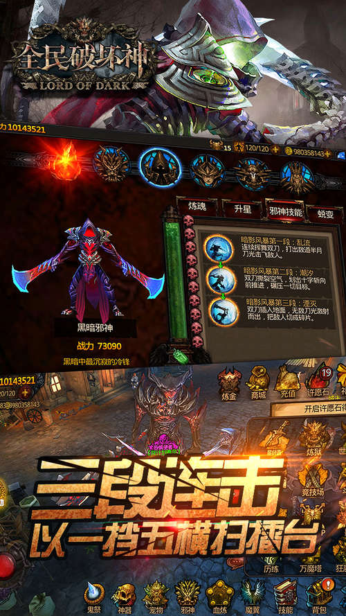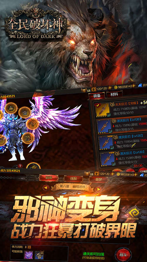 《全民破坏神》是一款炫酷精美的暗黑系动作RPG类手游大作,游戏的玩法很有趣,操作四种剑攻击加防御,每个剑都有特色,很有新意的游戏。虽然整个游戏没有一句话但是剧情也算表达完整了,这个还是蛮不容易的,而且通关后初始页面也变了,小细节好评。唯一的遗憾就是换卡少了点,还没玩痛快。必须下载支持一波!