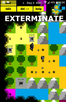 你从一个有50名士兵的黄色正方形开始。地图几乎被遮住了。首先扩大你的领地,增加你的视野。建造城堡,训练更多的士兵,并进一步扩大。