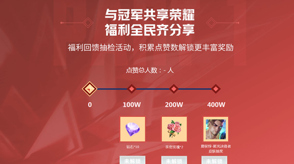 2.当活动总点赞人数分别达到100万、200万、400万时,参与点赞活动的用户皆可领取全民福利,分别为钻石*10、亲密玫瑰*2、参与 夏侯惇-匿光决锋者皮肤抽奖,必得铭文碎片*10,有0.01%概率机会抽出 夏侯惇-匿光决锋者皮肤;
