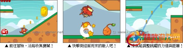 游戏操作:以键盘 A、D 键操作袋鼠移动,W 键跳跃 (可踩击敌人),滑鼠拖曳袋鼠控制跳跃方向和力度。