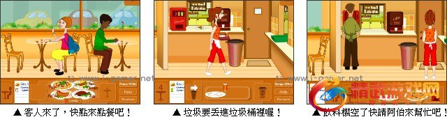 咖啡休闲小站提供非常多的美食与饮料,比萨、热狗、汉堡、咖啡、雪碧、可乐等 ... 而你将扮演是这间咖啡店的服务生。游戏採行横向捲轴方式进行,画面右下方状态列会显示客人的需要以及哪里需要点菜。游戏开始后等客人入座后,你要根据客人的点餐,到厨师那里点菜,由于厨师做菜需要时间,这时可以先去送饮料免得客人等的不耐烦掉头走人噢!
