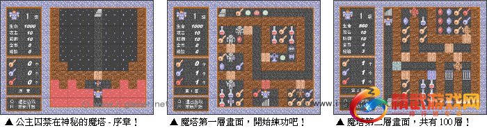 很久很久已前,一个美丽的公主被魔法师囚禁在一座神秘的魔塔里面。一个武功高强的英雄冒着生命危险来满是怪物的塔中拯救公主,可是刚刚进入魔塔就被坏人暗算,不仅武器和法术都丢失了,还被投入了监牢,幸好一同坐牢的小偷帮助你逃了出来,于是我们的英雄只好一边练功一边开始了他艰苦的救美之行……这个游戏虽然不大,但制作精美,道具也很多,对智商也是一次艰巨的考验,所以如果你喜欢挑战,就一定不要错过这款游戏,它绝对是打发时间的良伴,还可能会让你沉迷!