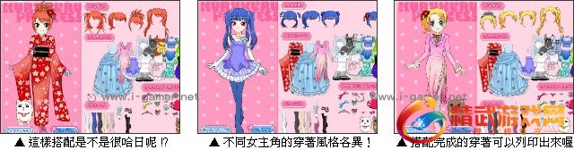 这是一款日系风的换装游戏,四位女主角都是日本的漫画女孩,纯真又可爱。姊妹们可以为她换上和服、英式摆裙、旗袍、芭蕾舞裙 ... 等各种可爱的裙装和漂亮的饰品,或是可爱的小猫打扮。还可以将搭配完成的穿着列印出来喔!