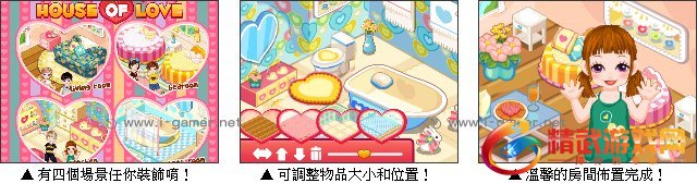 女孩们都喜欢布置自己的房间,利用各种物品装饰和摆设。游戏中总共有四种场景 ( 卧房、客厅、厨房和浴室 ) 让你自由布置,家具和装饰品还可以自由调整大小和位置,快来一起打造出充满爱的房间吧!