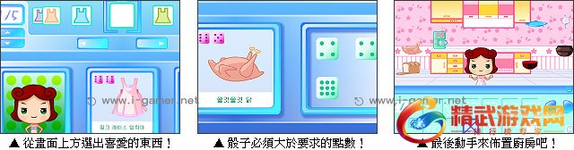 大头妹今天想要来做料理,但是厨房空蕩蕩的,她需要你的帮忙,从画面上方选择喜爱的物品,接着点击右方的骰子(可点击数次),骰出比要求的点数大就可以得到物品,陆续完成步骤后,就可以来摆设厨房,为大头妹打造一个有创意的厨房吧!