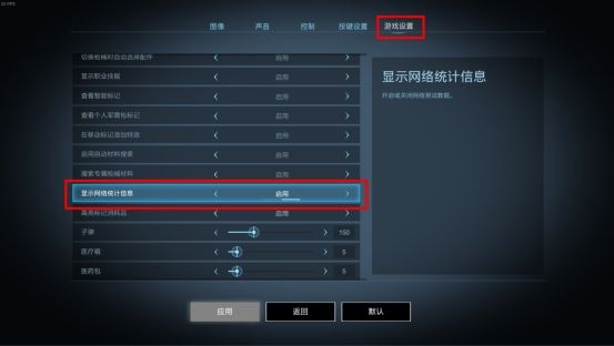 3、点击【游戏设置】,然后点击【显示网络统计信息】;