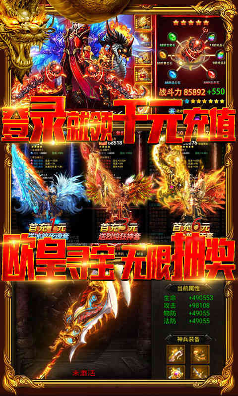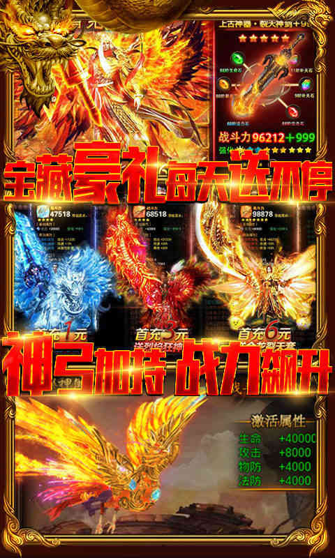 2. 上线即送元宝18888,金币188万,vip13(开启千元充值礼包后直接满v),vip礼包免费领不停,更有远古神弓轩辕、落日等你来拿。