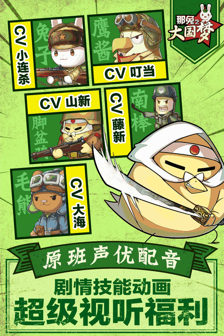 游戏内剧情、漫画、动画、引导、技能等各个模块,全部原声配音!兔子—小连杀,毛熊—大海,鹰酱—叮当,脚盆鸡—山新,南棒—藤新……超强大配音阵容,给你带来百分百还原的那兔视听体验;