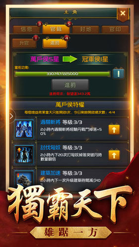 ——写实画风,完美还原三国经典战役,更贴合历史,设置官职品阶,分封制度。高品封地,众人所望,这是财富,更是荣耀。在这血雨腥风的乱世中,享受万人敬仰,却是最有实力者,才可达到,那个人,是否就是你?