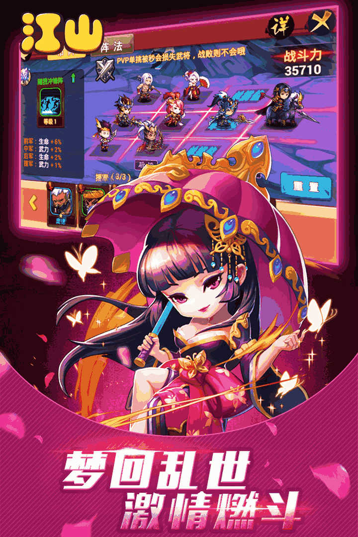 《江山》是一款经典互动的卡牌策略回合对战类手机网游,游戏中有着独具创新且颠覆传统的卡牌互动体验,众多净爽无比的战斗玩法机制,大量属性逆天的神兵利器任你使用,华丽无比的技能特效,只为带给玩家们享受到游戏中的每一个战斗细节,欢迎玩家们下载试玩!