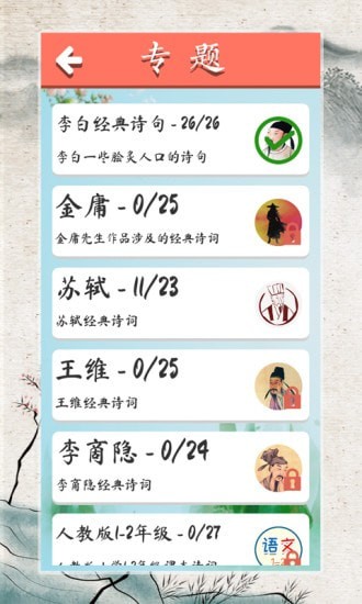 3.游戏的关卡会根据理解诗词的难易程度划分成不同的等级,玩家可视情况选择。