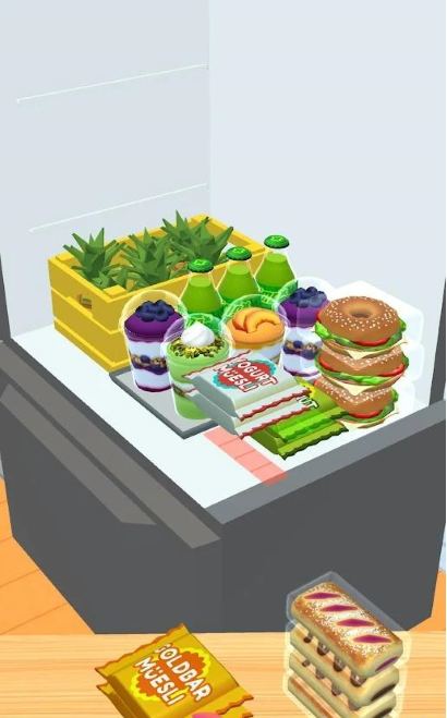 重新进货时间这款游戏里的冰箱里什么都没有,自己的进货时间开启了,在冰箱中需要将自己购买的货物全部放入,玩家的空间能力和想象能力需要发挥一下,让自己成为一个整理达人,需要有正确的的梳理与方向,把各种零食装满自己的冰箱。