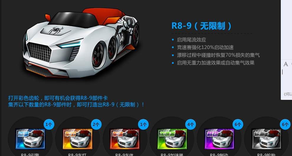 R8-X是BINGO最终奖励车,外形相比九代有很大的改变。与离子X相比,拖漂、启动加速度和加速时间好些。抓地提速、U弯、启动时间和集气稍差,加速提速差不多。车身长度比离子也有所改善,总体来说,论原版肯定比离子好些。但装上一样的部件后单论数据要比离子略差。