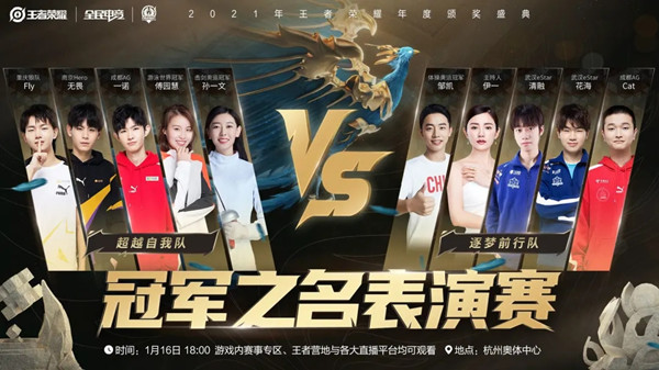 2021年王者荣耀颁奖盛典将进行两场表演赛,由傅园慧、孙一文、邹凯、伊一、KPL选手联合组队的【冠军之名表演赛】与KPL选手组队的【虎年贺岁表演赛】。