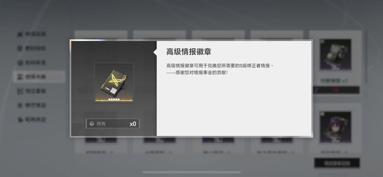 高级情报徽章相当于是特定等级通用的情报兑换道具,可以兑换成对应等级任意修正者的情报材料。这个物品游戏内也比较稀有,除了活动和福利赠送之外,只能通过购买一些礼包来获取。