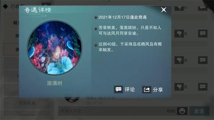 3.触发方式:达到40级,在南海采珠岛或栖凤岛有概率触发。(地点限定型奇遇,如果不触发,试试换线/来回进入【采珠岛】区域,或者提升天分·洞察等级)
