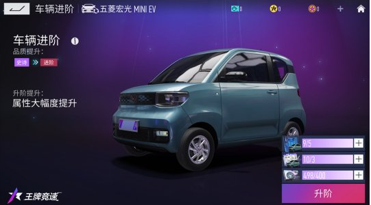完成进阶后,五菱宏光MINI EV将由史诗级提升为全新的进阶级,车辆外观虽未发生改变,但内在性能已经有了进一步的提升,各方面的属性都将更为优异,在比赛中将一鸣惊人,惊艳众人!变身进阶级辅助位赛车后,五菱宏光MINI EV的等级将重置为1级,车手们可以继续使用零件和蓝图对其进行升级,获得进一步的属性提升。