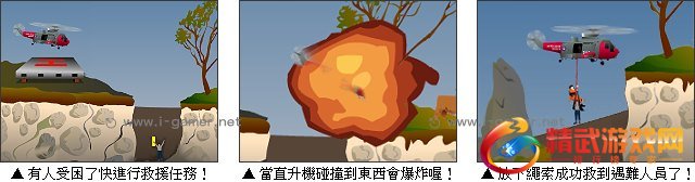 游戏操作:以键盘方向键操作直升机移动,空白键投绳索救人。