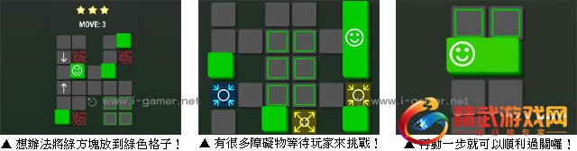「绿色方块归位」是一款好玩的益智过关游戏,除了考验玩家逻辑思考能力,也测试玩家的空间概念,赶快来挑战看看吧!游戏中玩家要将所有的绿色方块移至绿色边框的格子,利用笑脸方块带动其余绿色方块就可以顺利破关啰!喜欢逻辑思考游戏的朋友千万别错过了!