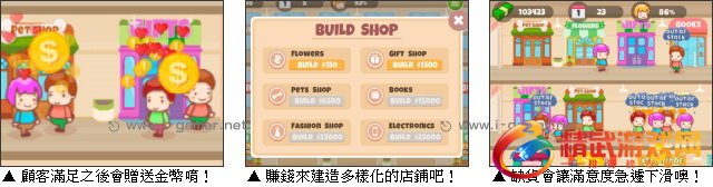游戏操作:以滑鼠操作进行游戏,点击空店铺建筑,点击商店能够升级、补货、拆除,点击金币收取小费。