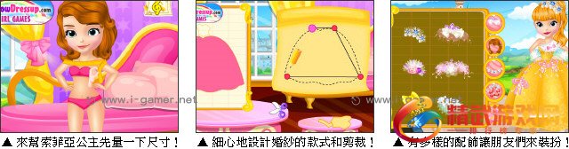 游戏操作:以滑鼠操作进行游戏,选取道具为索菲亚公主设计婚纱。