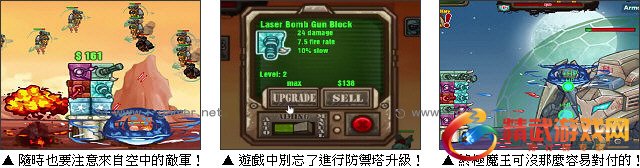 游戏操作:以滑鼠操作进行瞄准与发射,点击建造武器 / 升级砲台装备,空白键停止 / 继续 / 进入下一关,P 键暂停。
