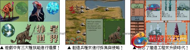 游戏中有袋鼠、人猿、章鱼三大外星生物,玩家必须一步步建立起自己的家园,合理的布置人力资源,不断地升级,开发出更先进的文明,打造强大的军队进行侵略。在发展过程中会遇到人口危机、食物危机、部落威胁,甚至是生存危机,玩家要想办法克服这些问题,建造出强大的外星帝国。