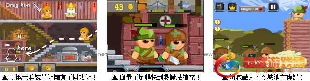 平静的王国某天拉起了警报,大群怪物企图入侵城堡,伟大王国的城池可不能被侵佔,所以这次守卫战不容有失。玩家的任务就是要合理的派遣兵将,做出最适当的攻击与防守,士兵可以更换三种不同的能力,还有各种道具能辅助帮忙,并随时补充血量。快将所有敌人通通都击败吧!