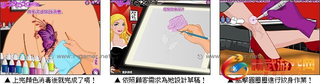 今天你将扮演一位专业的纹身艺术师,要帮前来光顾的客人设计完美的刺青图案。在故事模式中,依照跟顾客的谈话内容来选择适合的刺青图,再亲自为客人刺青;创作模式中,你可以自由的为客人搭配服饰与髮型喔,快来展现纹身艺术的魅力!