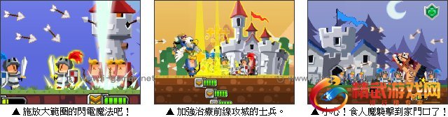 游戏操作:以滑鼠操作进行游戏。生产右下角矿工赚取金钱,并利用建设军营制造士兵战斗。第三关开始可以使用城堡上方的绿色符号治癒群体,过关后还可以升级各种士兵。