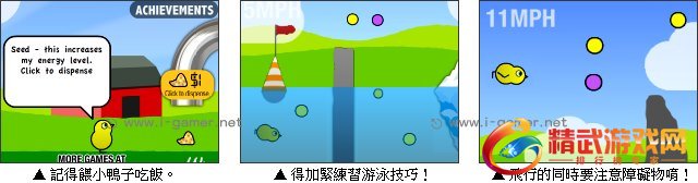 小鸭子的生活第三部推出啰!这次小鸭子可以进化成不同的鸭子,首先选择一个你想培育的种类,接着要喂食牠,帮牠锻鍊身体,训练游泳和飞行等技能。训练过程中别忘了收集钱币,利用钱币可以提升技能等级。用心培养这个小鸭子吧!