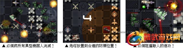操作方法:以键盘方向键操作雷电战士移动,滑鼠左键射击,点选画面左上角的炮塔放置到合适的防御位置,右上方的图启动敌人的进攻。