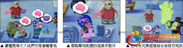 僵尸的世界也需要追求一些时尚的元素,在这家小小僵尸工作坊里,小僵尸将会被用裁缝的方式表现出来,只要依需求将指定材料交给裁缝师,并且经由合成步骤,就会有时尚小僵尸被制造出来喔!