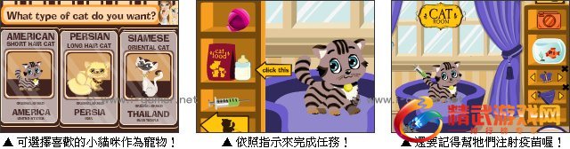 你喜欢可爱的宠物猫咪吗?现在有机会可以让各位玩家饲养照顾牠们喔。游戏开始可以先选择自己喜欢的小猫咪,接下来依指示喂牠吃饭、喝水、洗澡,还可以带牠出去大小便,最后还可以帮她打扮拍个照片留作纪念喔!