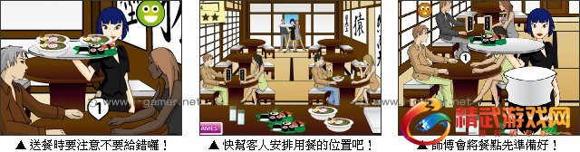 游戏中玩家要经营一家日式料理的速食店,从带位到点餐送餐甚至是收桌都要一手包办,厨房的师傅会一直不断提供所需的餐点,要注意的是每桌客人点的食物都不同,不要送错啰!