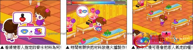 游戏操作:以滑鼠操作进行游戏,客人会显示他们所需的香水,根据提示到相应位置拿材料制作香水给客人。