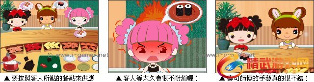 游戏操作:以滑鼠操作进行游戏,按照客人的需要选择米饭,紫菜,鱼生,青菜 ... 然后点盘子拖次给客人。