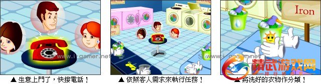 游戏操作:以滑鼠操作进行游戏,先把衣物放到绿色洗衣机裏洗,然后放到红色洗衣机裏烘乾。