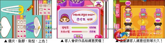 游戏操作:以滑鼠操作进行游戏。按照画面右上角的首饰样子来上颜色、选零件,如果是比较复杂的装饰品还要用到胶水来吧它们沾起来,制作完成后点击画面右侧下靠右边的按钮完成制作。