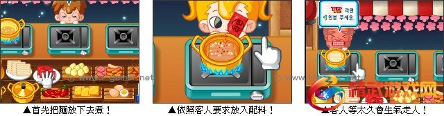 小美 的夜市大排档开张了,这里每天都有好多人来逛街,当然生意越来越忙,快一起来帮帮小美吧!客人进门后会开始点餐,首先选择大锅或是小锅放在瓦斯炉上加入高汤,在点燃瓦斯炉接着依序加入麵块还有红色调味包,最后的配料要依照客人的只是去添加,煮好后交给客人就完成啰!