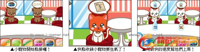 小厨师再镇上开了一家宠物餐厅,顾名思义来这里用餐的都是可爱的小动物,有小猫、小狗等等,要依照他们点的餐点来帮他们准备喔,拿错了他们就会生气不吃,使用滑鼠操作拖曳他们需要的餐点到他们面前就可以啰,最后别忘了要帮他们买单。