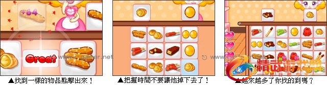 阿 Sue 经营了一家点心舖,里面卖了各式各样的麵包当然还有各种美味可口的点心,客人点餐后的图卡会从右边送过来,你只要使用滑鼠操作点击下方相对应的物品就可以了,一共只有三次机会,越后面的关卡速度会不断加快,商品也会越来越多喔!