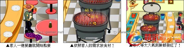 游戏中玩家将扮演韩国烧烤餐厅的老板,并且好好经营这家店,让每个客人都能吃到美味的烧拷,客人进门后会在头上显示它需要的餐点,接着再把食材放到烤炉上它会开始自己烤,等他跑到百分之100就可以拿给客人啰,如果考太久就会焦掉就要重新一次了,客人等太久可是会生气的喔!