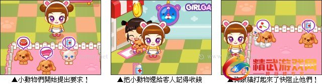 阿 Sue 的宠物护理站,客人们会带着他们心爱的小宠物来这里,你要帮客人好好照顾这些宠物,牠们要吃饭、洗澡、玩玩具,生病了还要帮牠们打针,每一个细节都要顾到喔,另外如果把狗跟猫放在一起他们会打架,你要用玩具把他们分开,照顾宠物是一件非常有趣的工作,快来试试吧!