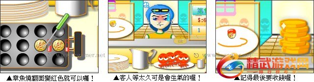 超级美味的烤章鱼丸来啰!首先点击盘子,接着在烤盘中倒入麵糊,拿起章鱼放进麵糊中,在拿取右边的签子翻转章鱼丸,等到旁边的能量调变成了红色就可以拿起来啰,放入盘子中再依照客人需要的酱料加入就可以交给客人,最后可别忘了收钱唷!