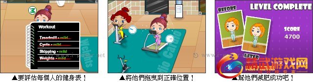 这里开了一间健身俱乐部,他提供专门为需要减肥的女生们的一套课程,客人进来后点击他的左边会有他的体型以及健身表,你必须依照上面的指示将客人拖曳到正确的健身器材,接着还要选择适合他们的强度,才能达到最佳的效果,快来帮助他们减肥成功吧!